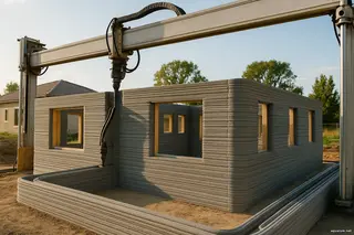 Гигантская рука-манипулятор движется по рельсам, слой за слоем выкладывая материал — и на глазах начинает расти дом.