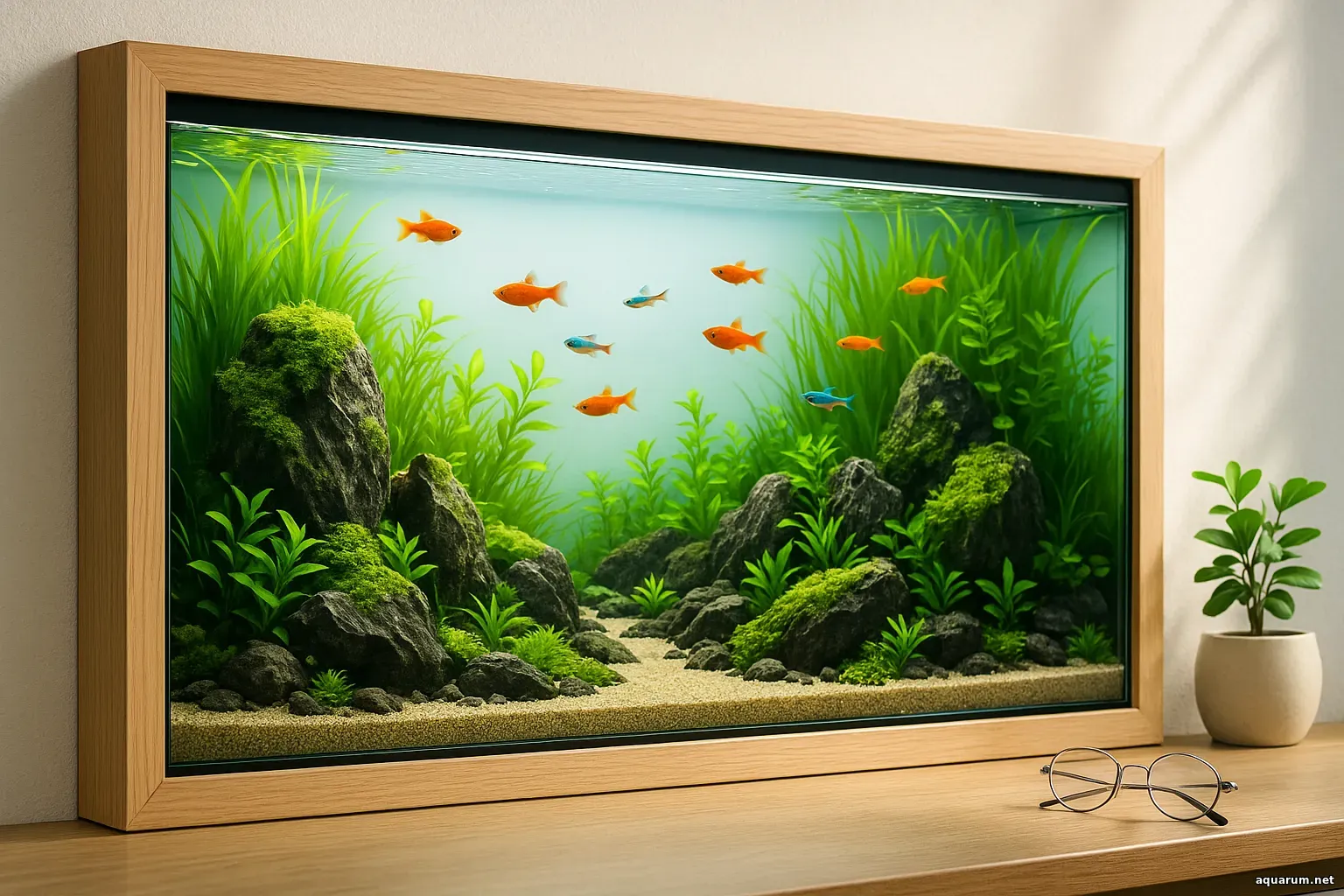 Так родилась идея аквариума, напоминающего панель или телевизор. Со временем формы стали ещё изящнее, и появились модели, напоминающие картины: узкие по толщине, но широкие по горизонтали, позволяющие наблюдать панорамный подводный пейзаж, словно живую иллюстрацию.