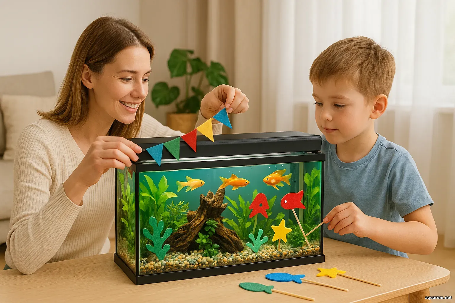 DIY-декор с ребёнком — это не просто украшение аквариума. Это память. Каждая фигурка или флажок будет напоминать о совместных вечерах, о радости творчества и о первых шагах ребёнка в мир аквариумистики.