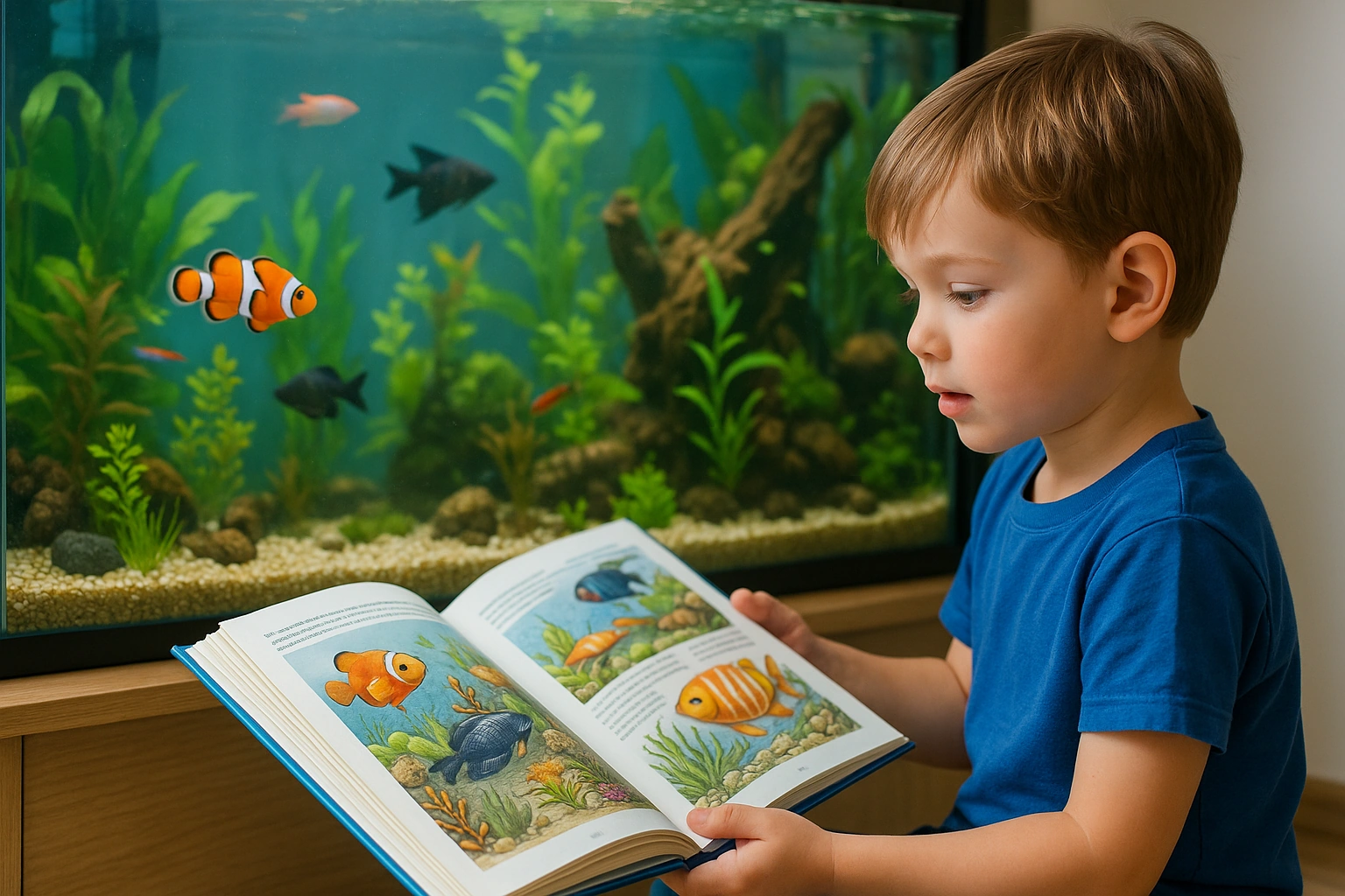 Представьте: ребёнок стоит у аквариума, лоб почти касается стекла, глаза следят за каждым движением рыбки. Рядом лежит книга – яркая, с большими разворотами, где на глянцевых страницах живут те же самые рыбки, только нарисованные и сфотографированные. Ребёнок то смотрит в аквариум, то в книгу, и между стеклом и страницей возникает невидимый мост: реальность и знание соединяются в одно целое.