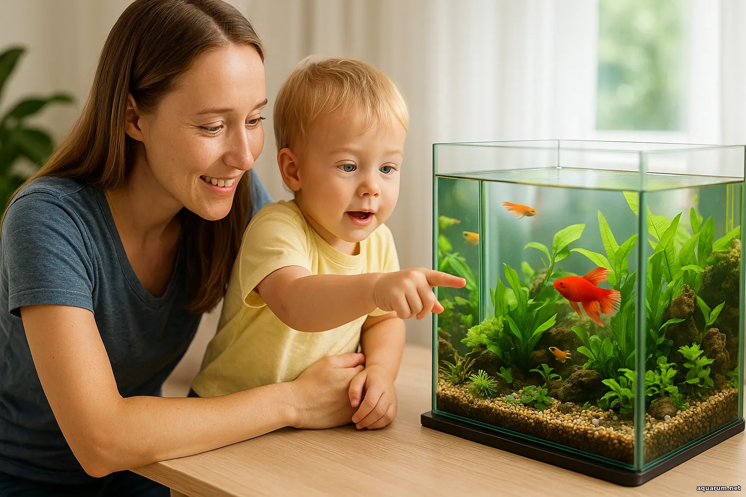 Если ребёнок очень маленький, стоит поставить аквариум на высоту, недоступную для прямого контакта, или в место, где он может смотреть, но не дотянуться руками.