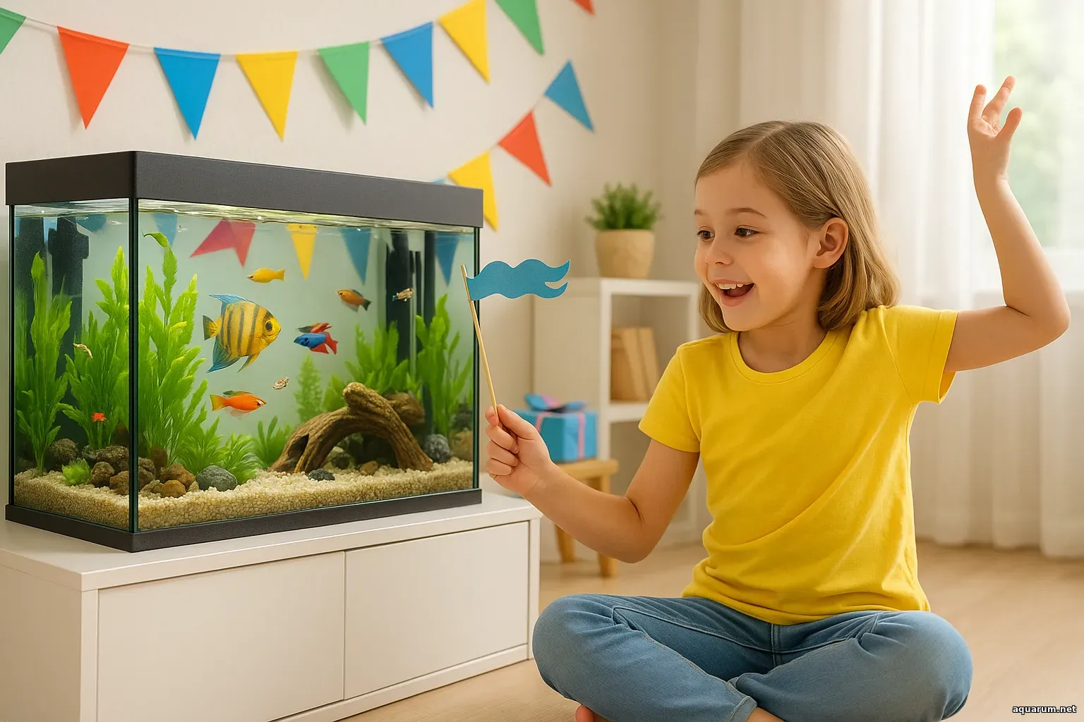 Флажки — это сердце мини-карнавала. Они создают ощущение лёгкости и движения, даже когда в аквариуме тишина.