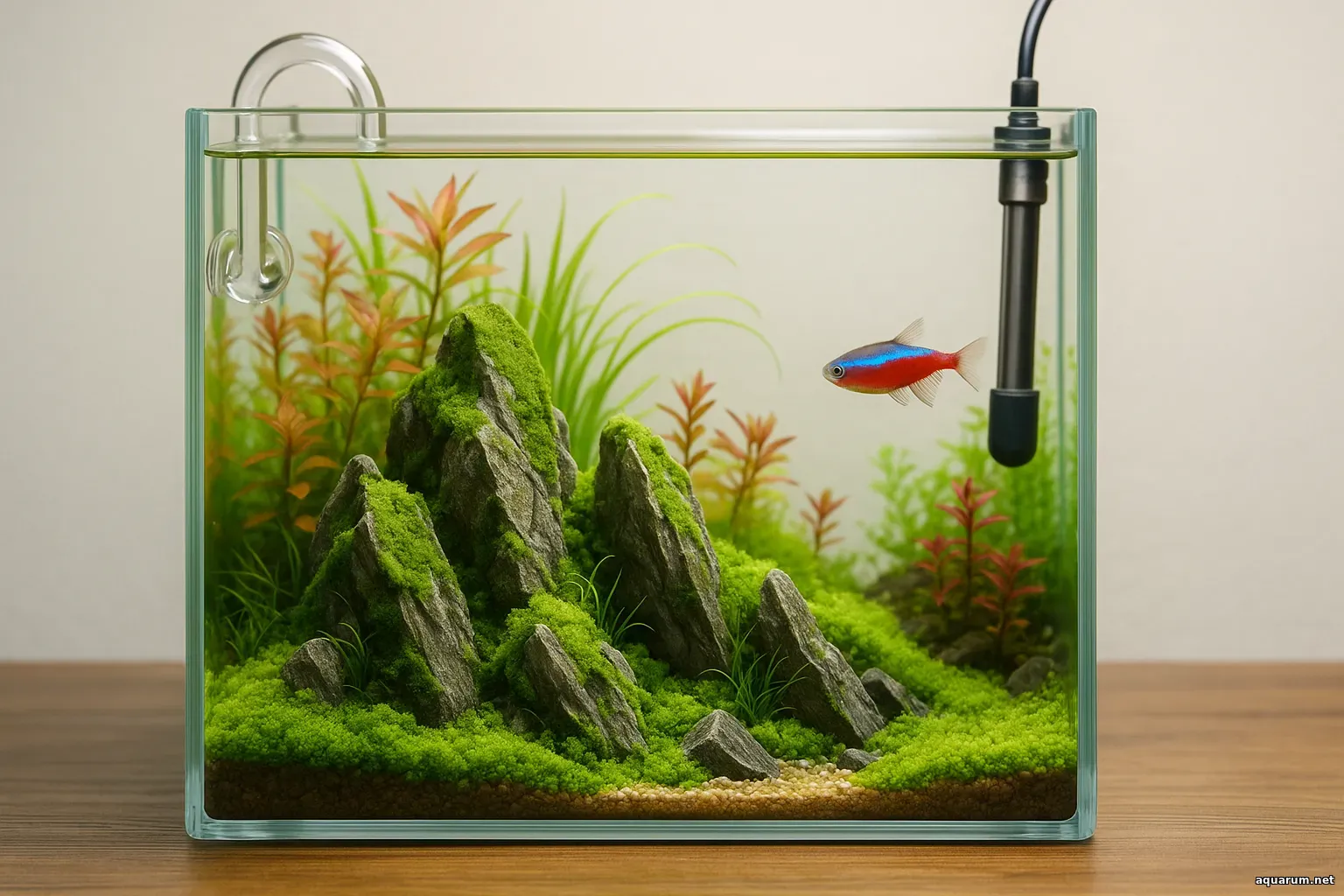 Наноакваскейп — это вызов. Ограниченность пространства требует максимальной точности в выборе каждого элемента. Здесь нет лишнего места для случайностей, каждая деталь работает на общую композицию. В результате аквариум превращается в своеобразный пейзаж, заключённый в стеклянную рамку, — живую картину, которая изменяется день за днём.