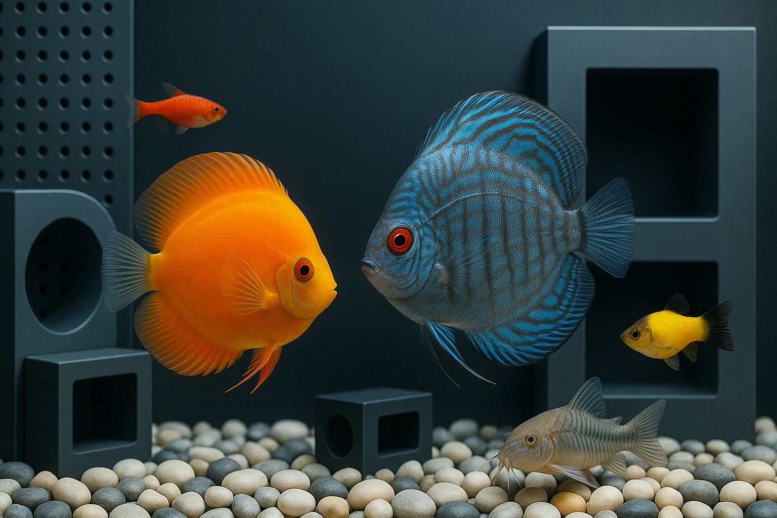 Главная задача декора в хай-тек аквариуме — не имитировать природу, а создавать визуальную структуру, похожую на архитектуру или техногенный объект.