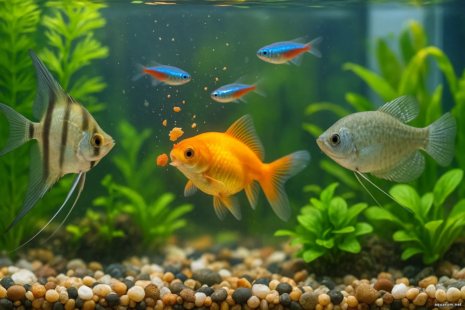 Сначала можно накормить самых активных рыб небольшим количеством, чтобы они насытились. Затем, через 1–2 минуты, добавить корм для более медленных или донных видов. Так вы избегаете ситуации, когда быстрые съедают всё сразу.
