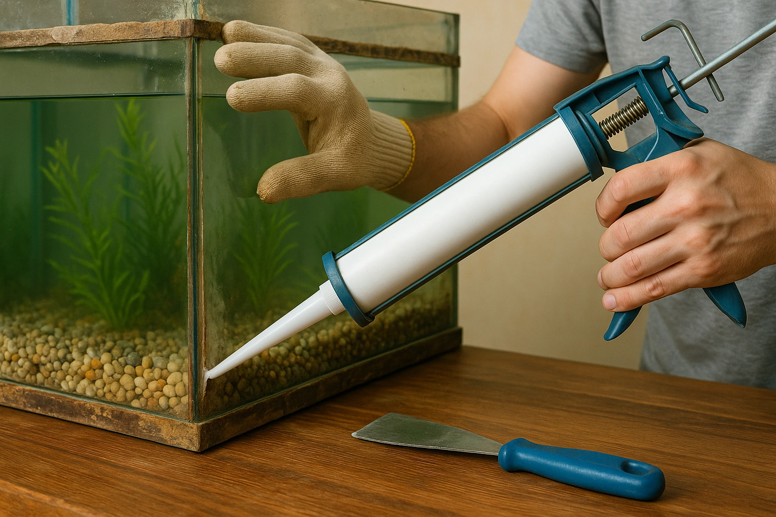 Главное — качество герметика. Нельзя брать «любой универсальный», «санитарный», «с антигрибковой добавкой» и тем более с пометкой «не для контакта с водой». Только специализированный аквариумный или стекольный силикон без фунгицидов.