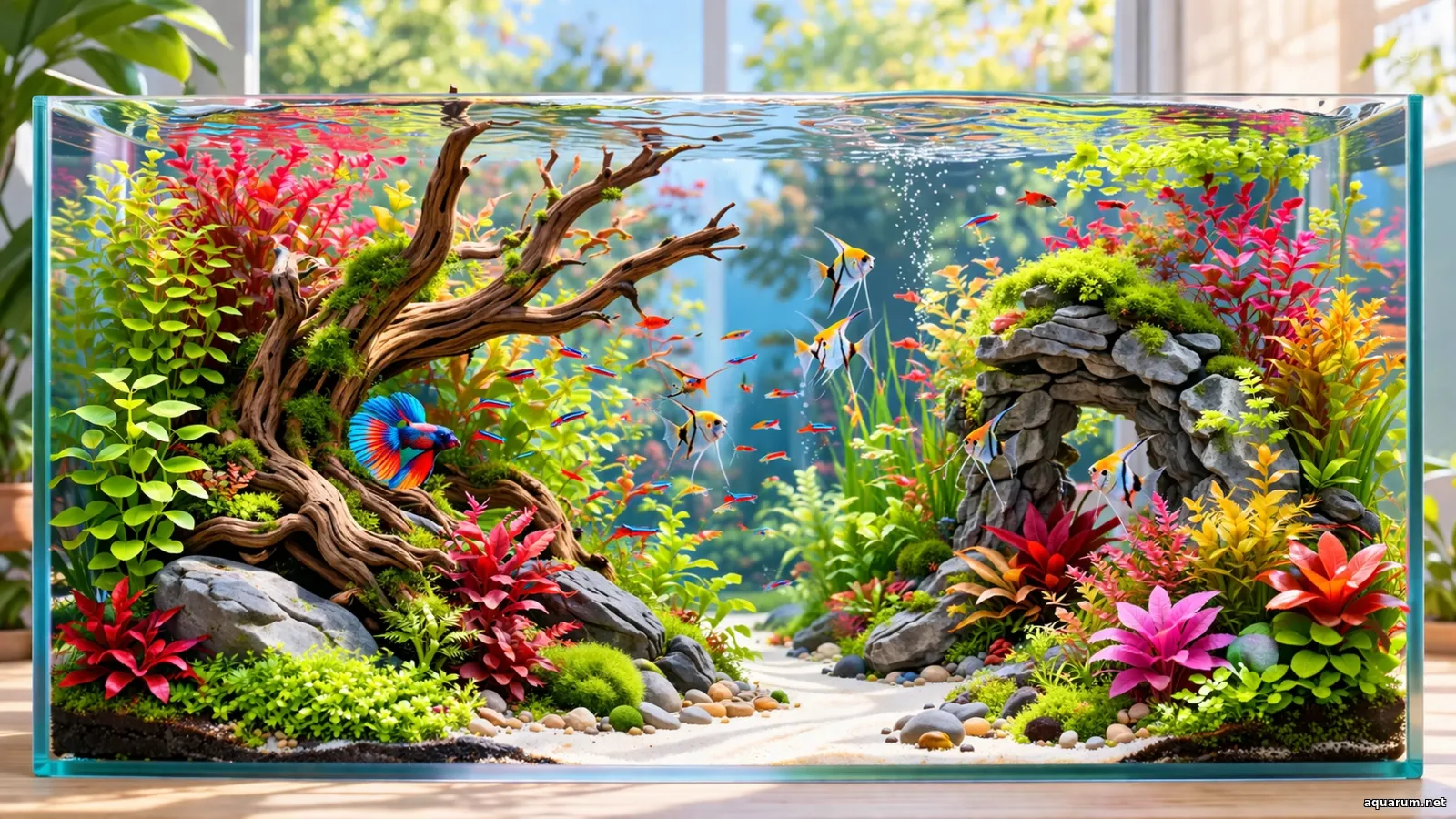 У цьому фото акваріум постає як справжній живий пейзаж у склі: прозора вода, денне світло, яскраві рибки, соковита зе...