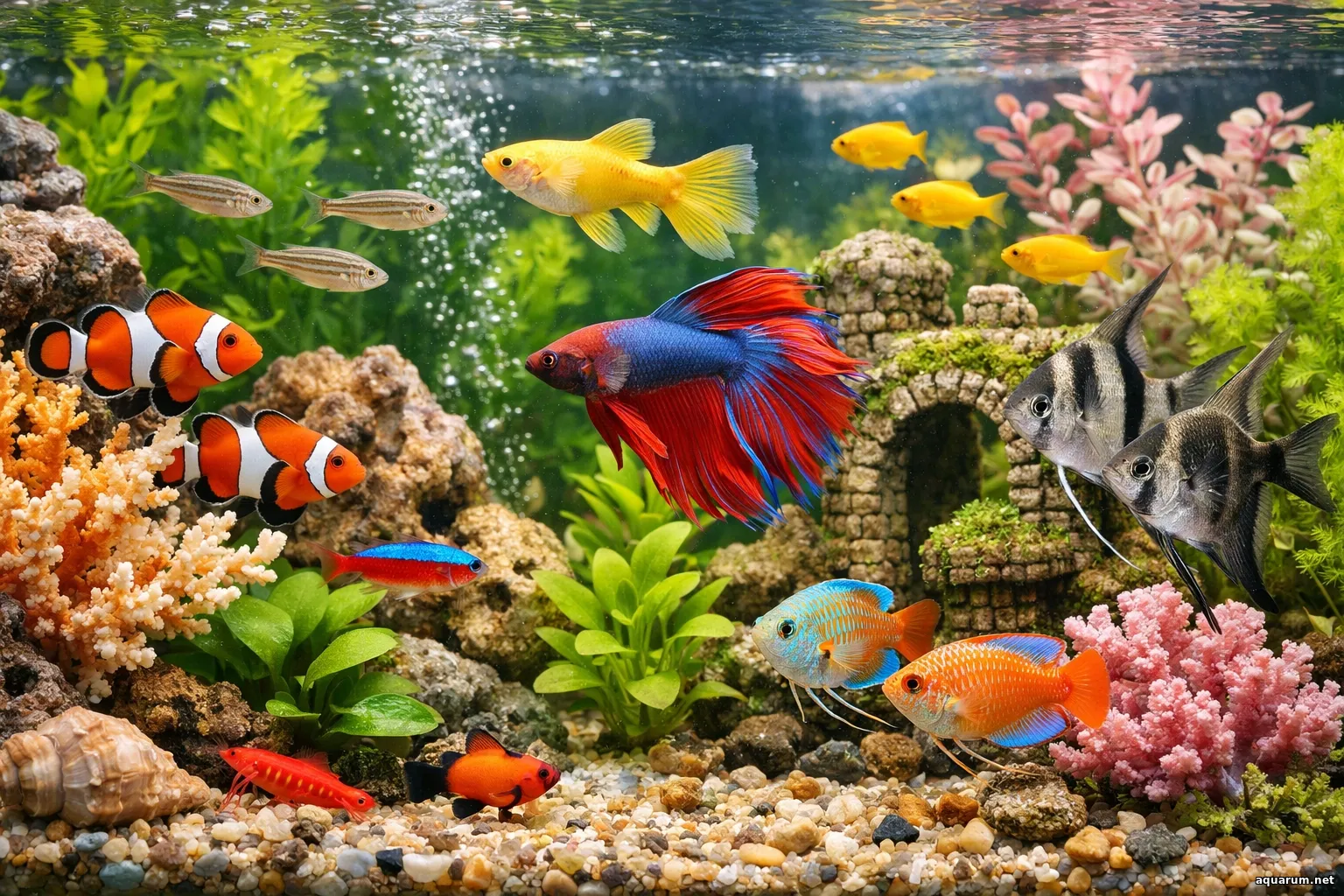 Широкоформатне яскраве фото домашнього акваріума крупним планом передає живу красу підводного світу у світлих тонах. ...