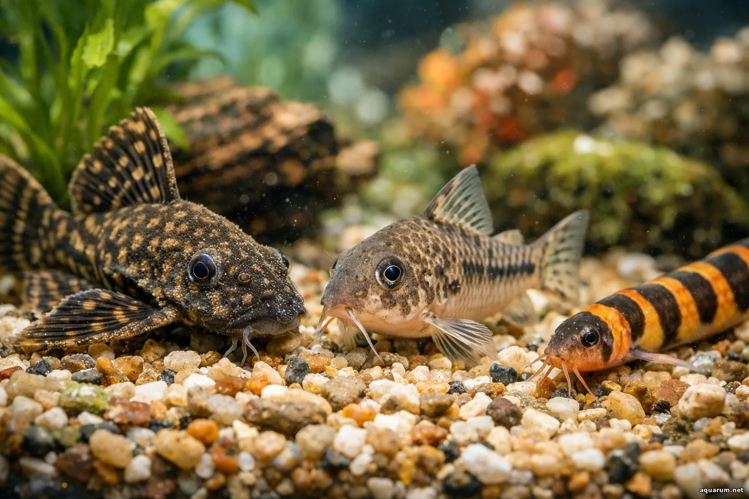 Крупний план донних риб у домашньому акваріумі відкриває тихе, але напрочуд насичене життя на дні. Світлий широкий ка...
