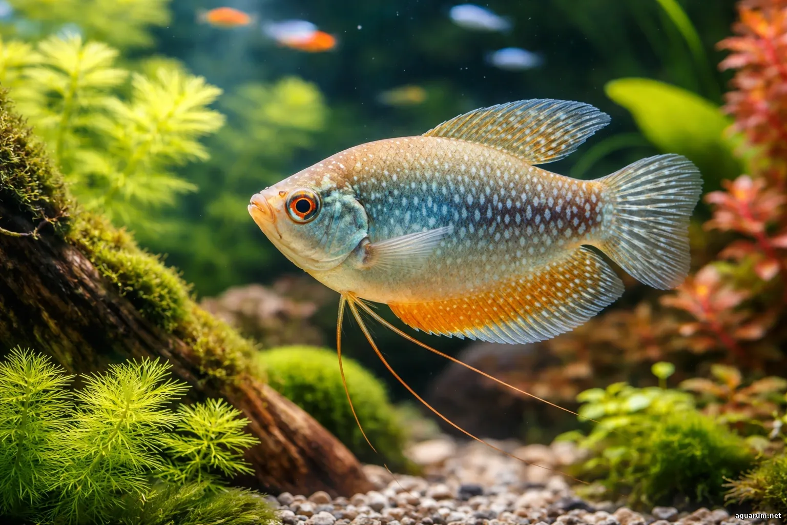 Яскравий крупний план гурамі в домашньому акваріумі передає спокій, витонченість і природну красу цієї риби. Ніжні пе...