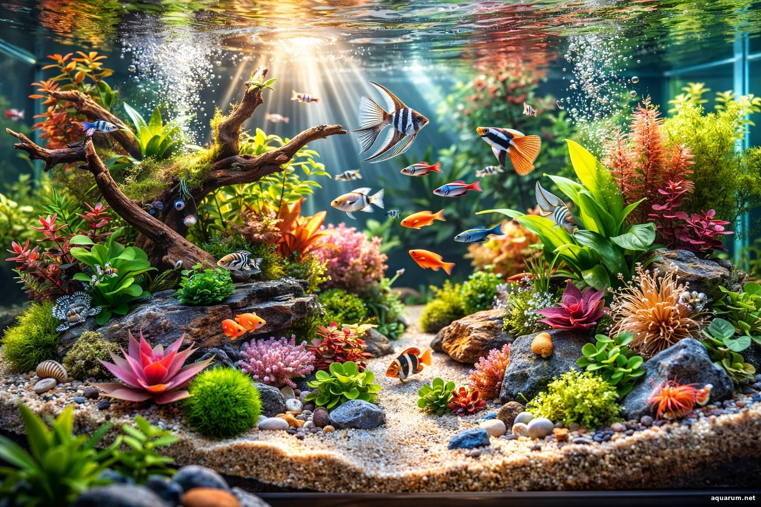 Яскравий домашній акваріум крупним планом: кришталево чиста вода, промені світла, легкі бульбашки та насичена 3D-комп...